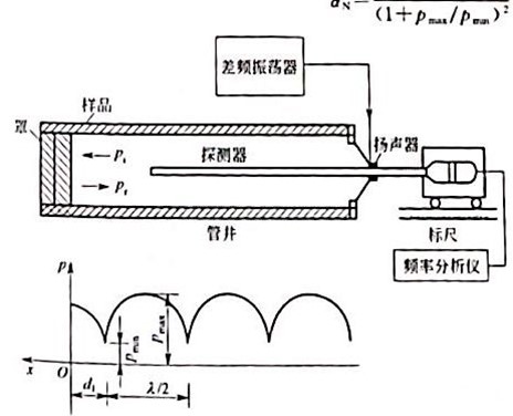 多孔材料的吸聲系數可采用駐波管(阻抗管)進行測定。駐波管結構示意于1。當揚聲器向管內輻射的聲波(圖中Pr,表示入射聲波)在管中以平面波形式傳播時,它們在試樣材料表面和揚聲器之間來回多次反射(圖中Pr,表示反射聲波),從而在管中建立了駐波聲場。其原理是在法向入射條件下入射正弦平面波和從試樣反射回來的平面波疊加。由于反射波與入射波之間具有一定的相位差,因此疊加后產生駐波。當揚聲器向管內輻射的聲波在試樣表面反射后,就會在管中建立一個駐波聲場。于是,沿管軸線出現聲壓極大、極小的交替分布,利用可移動的探管傳聲器接收這種聲壓分布。圖中Pmax,表示距試樣表面產生的第一個聲壓極大值,Pmin表示距試樣表面產生的第一個聲壓極小值,根據這一組測量值就可計算出材料的垂直入射吸聲系數: